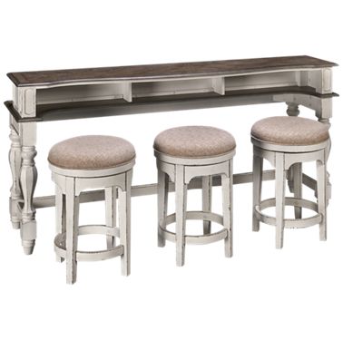 Two cream bar stools with padded straight line back and chrome finish adjustable base complete seating at this bar table set. The Bar Units and Bar Tables 3 .Shop for the Coaster Bar Units and Bar Tables Three Piece Bar Height Table and Stools Set at Standard Furniture Your Birmingham, Huntsville, Hoover, .Bring the pub to your own home with these stylish table sets for sale! From rustic to modern, these pub tables and chairs are available in a variety of styles..Shelter Bay Counter Height Multipurpose Bar Table Set. Use this counter table set in your man cave or living room to give you the perfect spot to enjoy food and .We gave our Portside Bar Table Set a rustic look by wire brushing its solid wood frame and adding a weathered finish. KEY DETAILS • All wood is .Choose one of our outdoor bar sets, or create your own bar set using any bar stool or hightop table. Teak Warehouse offers a robust portfolio of fully assembled .Rustic 3Piece Bar Table Set Includes 2 backless barstools and console table Rustic and industrial style is perfect for a breakfast nook, kitchen or living area .Our breakfast bar sets include: breakfast table set, breakfast pub table set, breakfast bar tables, and breakfast bar setwith choice of stool .Browse a large selection of bar tables for sale, including pub tables, 30'' Round Laminate Table Set With 4Ladder Back Metal Bar .Dine in style with a 3piece pub table set from Coleman Furniture. We offer a Parkland Walnut 3 Piece Counter Height Dining Set with 2 VBack Bar Stools.